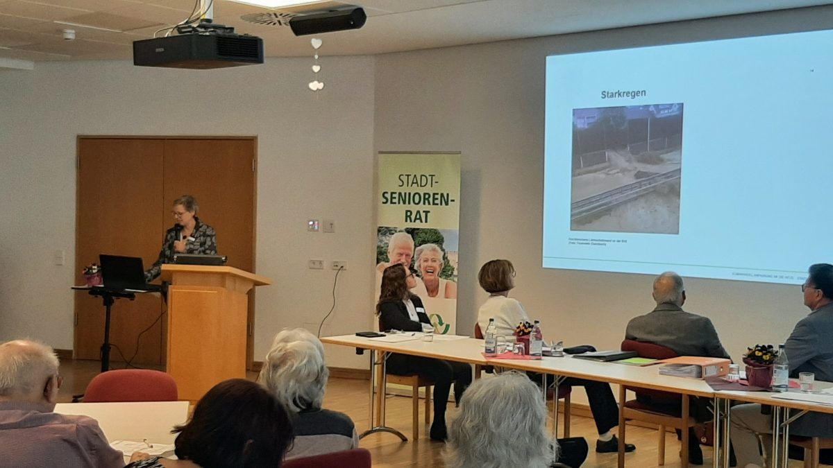 Tradition hat auch der TOP Vortrag. So berichtete die Referentin Frau Astrid Geiger, Landratsamt Göppingen, Leitung Stabsbereich Klimaschutz und Klimawandelanpassung zum aktuellen Thema „Klimawandel – Anpassung an die Hitze“. Bedingt durch den Klimawandel stieg die mittlere Jahrestemperatur in Baden-Württemberg um 1,7 Grad Celsius. Die Sommertage (ab 25 Grad) sind von 15 auf 30 Tage – und die Trockenperioden von 12 auf 14 Tage gestiegen. Die Vegetationsperiode wird um 30 Tage länger. Klimawandel erfordert Schaffung von Maßnahmen hinsichtlich Klimaschutz und Treibhaus-Emission. Dies bedeutet Anpassung durch Maßnahmen, die Folgen von Hitze, Dürren, Starkregen und Hochwasser verringern. So soll in Geislingen ein „Flutinformations- und Warnsystem“ eingerichtet werden. Geislingen bietet auch eine etwas andere Stadtführung „Mei schattigs Plätzle“ an (Termine sind bei Frau Pfau Stadtverwaltung einzeln – oder auch als Gruppe zu erfragen per E-Mail sonja.pfau@geislingen.de, Tel. 07331 24-303). In der Stadtbibliothek gibt es bereits einen öffentlichen Wasserspender. UV-Strahlung kann zu Kopfschmerzen, Augenreizung, Husten und zu hitzebedingten Sterbefällen führen. Die Senioren sollen sich informieren und selbst schützen. Der Landkreis Göppingen hat eine kleine Broschüre „Hitzeknigge“ herausgegeben. Tipps: Ausreichend TRINKEN (2,5 l/Tag!), um eine Dehydrierung zu vermeiden (Mineralwasser, Tee etc…). Für das eigene Wohlbefinden kann man Gebäude sanieren, Gärten gestalten, morgens und abends Lüften und von außen und innen die Fenster verdunkeln. Man kann die Ernährung anpassen (leichte, kleinere Mahlzeiten) und auch Medikamente vom Arzt anpassen lassen. Klimaresistente Pflanzen vertragen Hitze und Trockenheit. Nachts kann man mit feuchten Tüchern die Verdunstungskälte nutzen. Bei Schwitzen sind die Stirn und der Nacken zu kühlen.